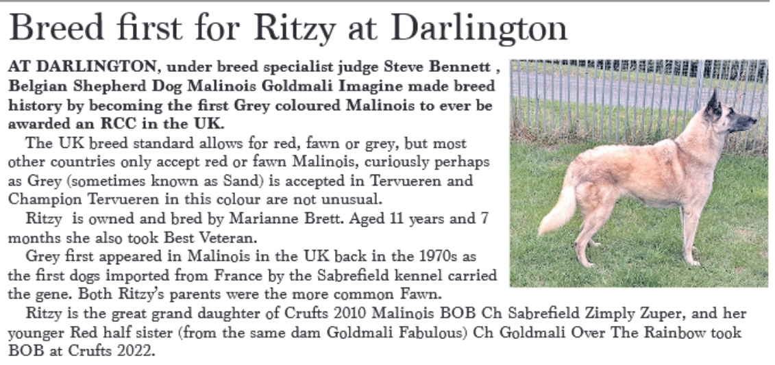 BE AWARDED A RESERVE CC, at Darlington Championship show.